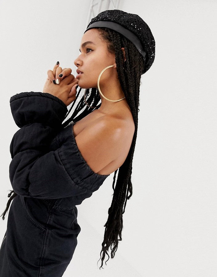 -Off-the-shoulder "Bardot" neckline with integrated padding for a sharp, structured silhouette.
