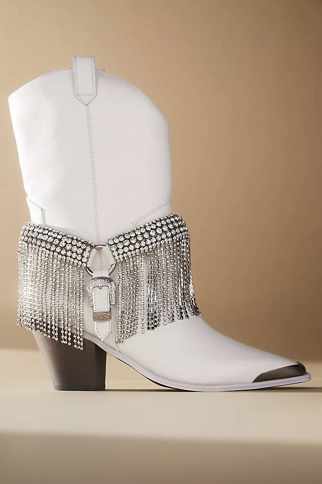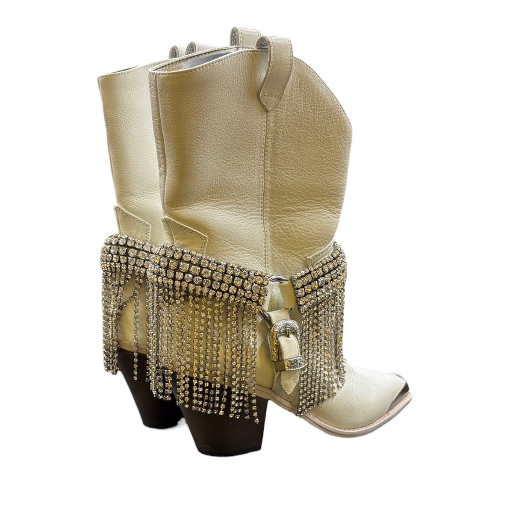The High Noon Boots feature soft Italian leather accented by a rhinestone fringe harness. With extra interior padding for added comfort, these boots were made for dancing the night away.