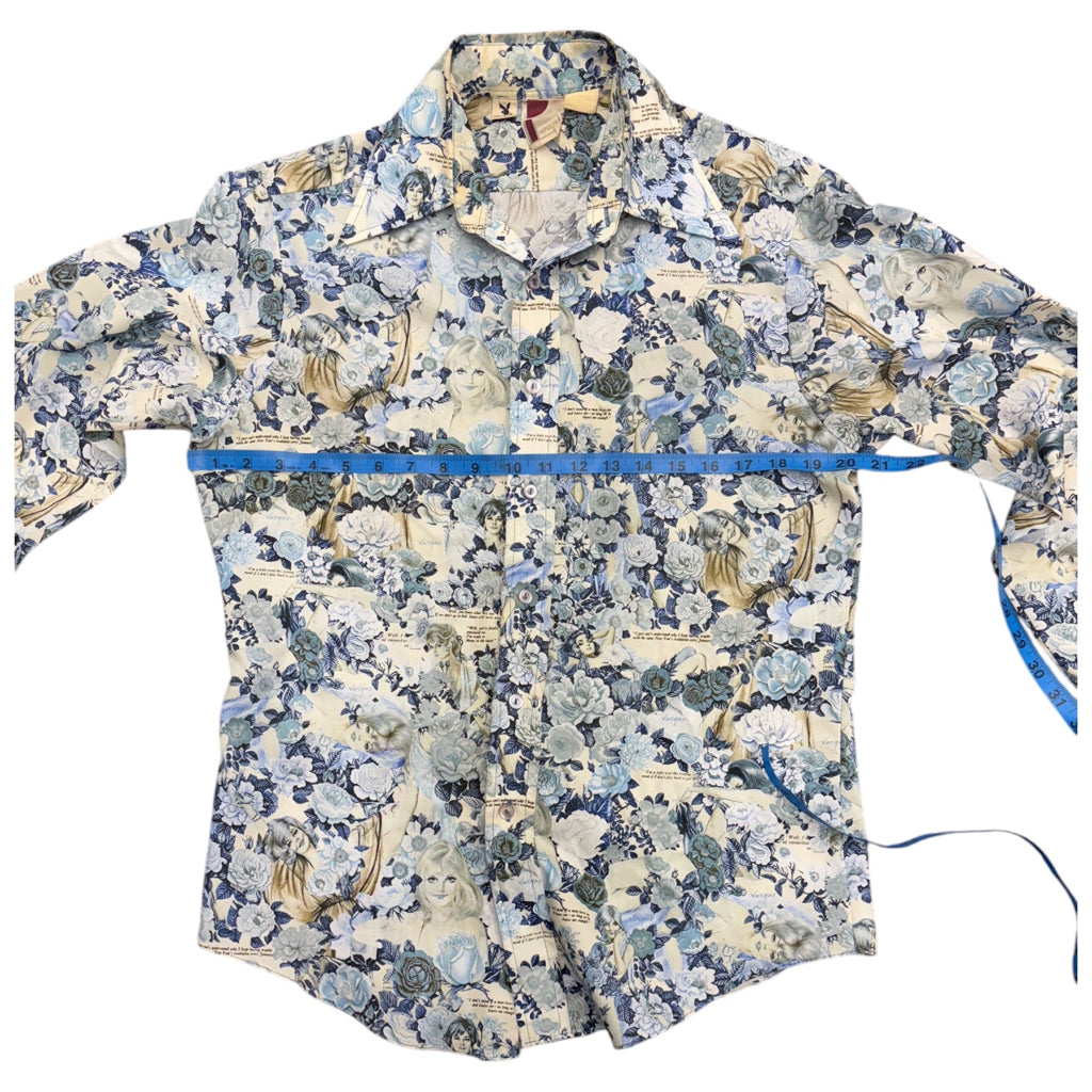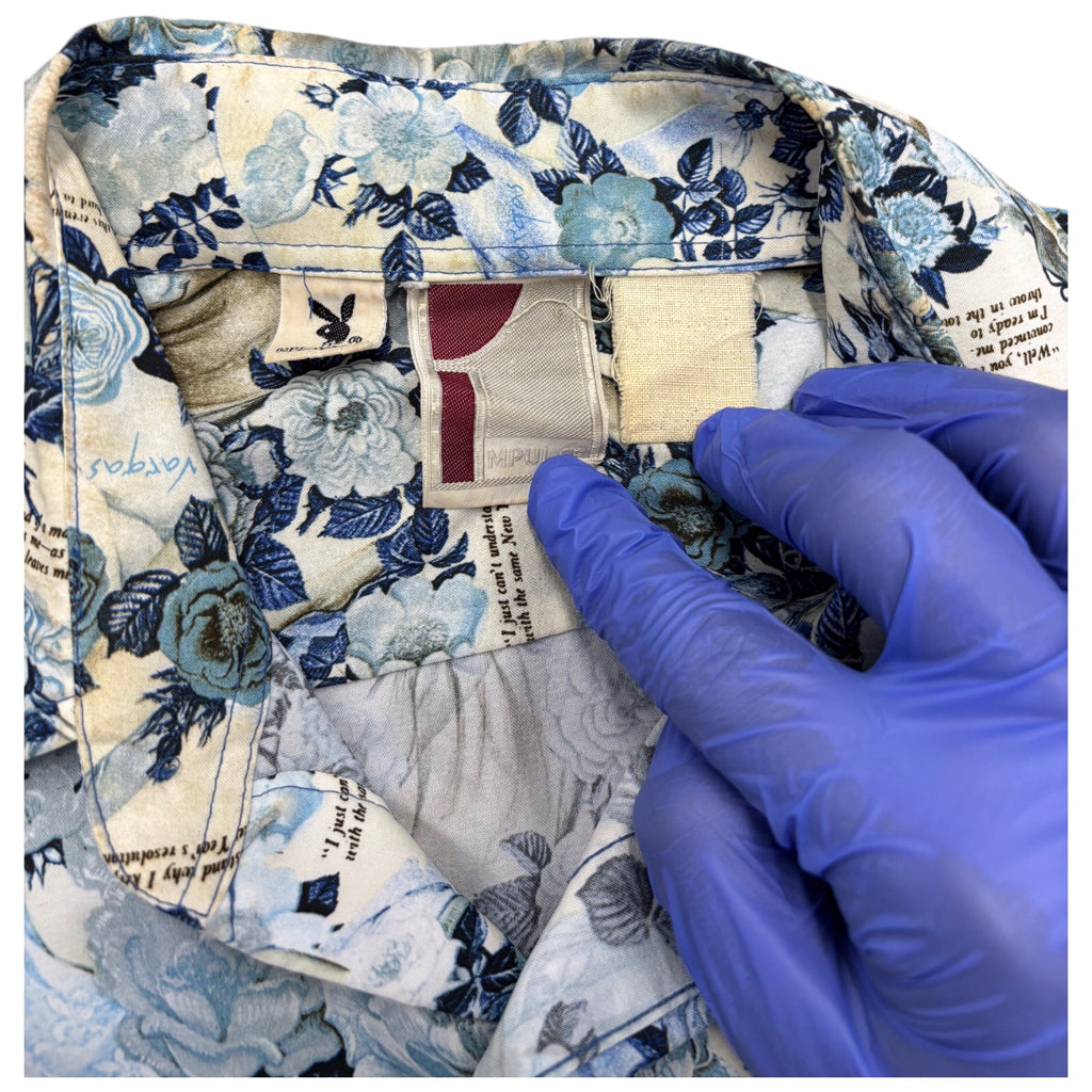 PLAYBOY Mens White Blue Vintage Y2k Floral Model Print Long Sleeve Button Sz L
