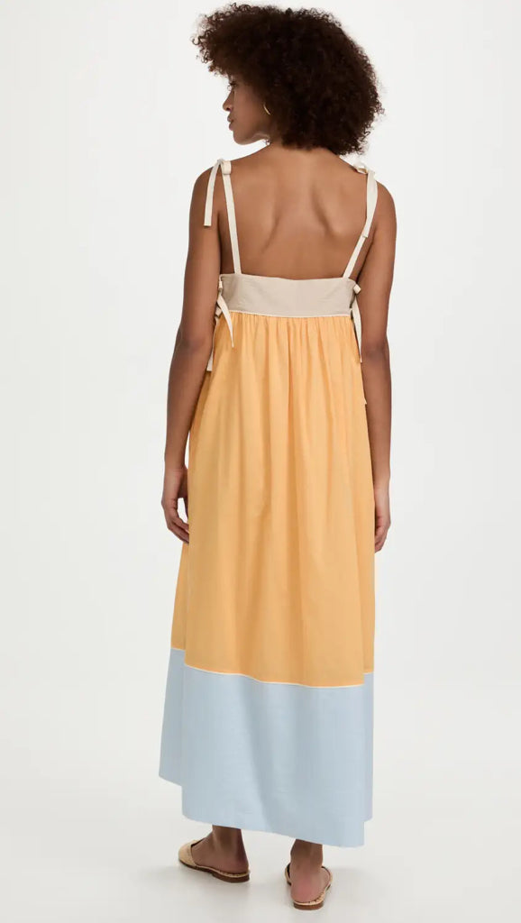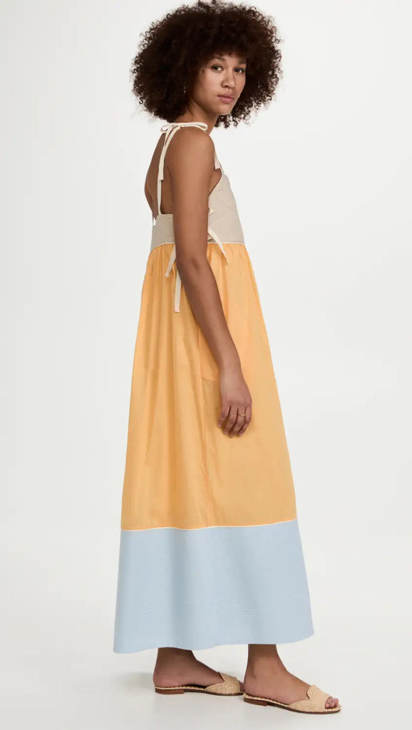 The color-block dress in lightweight cotton voile is detailed with trapunto stitching on the long tiered skirt. It has adjustable grosgrain ribbon straps for the perfect fit, a gre